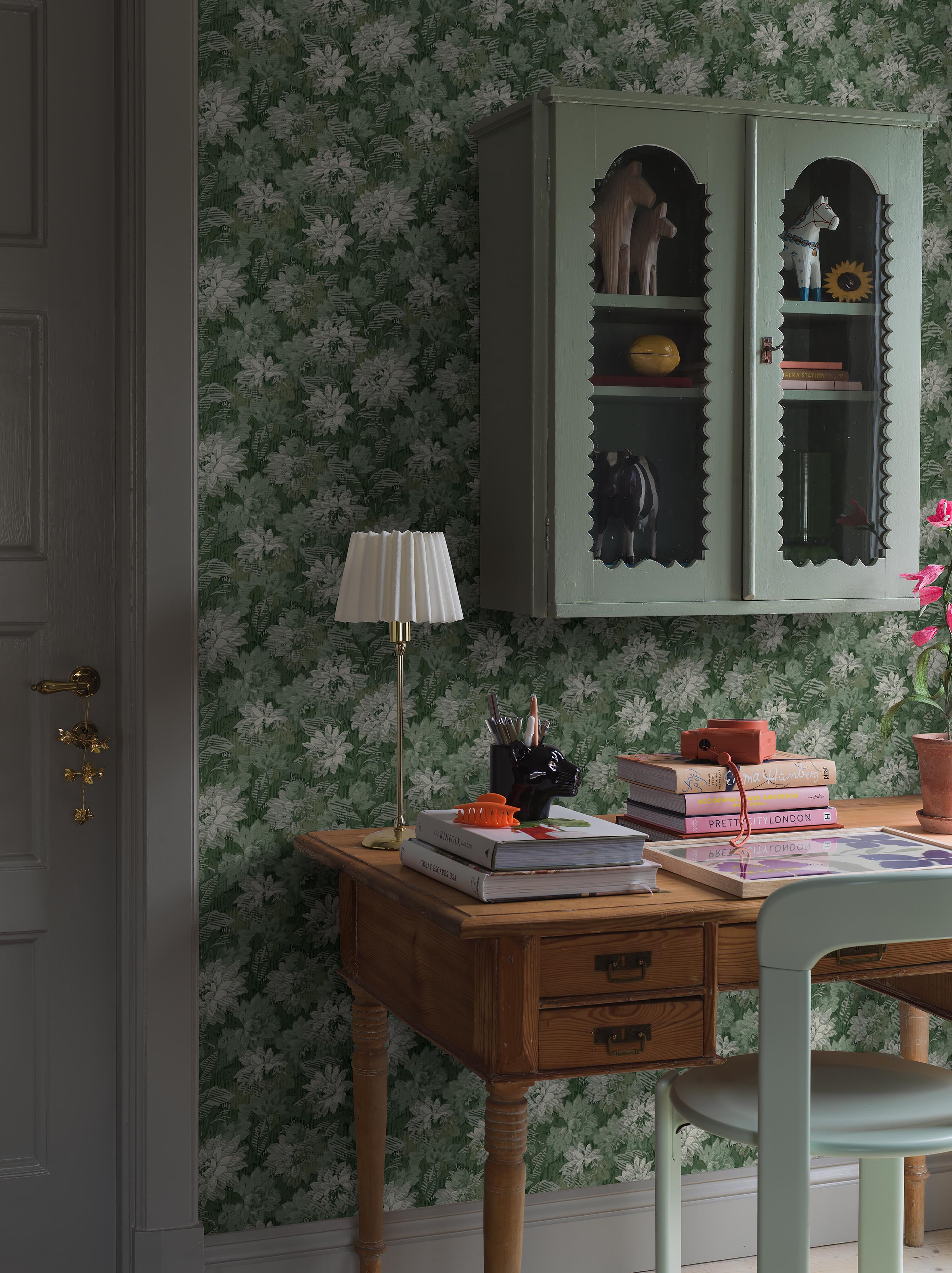 Kontrastingų žalių atspalvių „Delilah“ tapetai sukuria subalansuotą, harmoningą ir ramią nuotaiką. Gėlių gobeleno raštas, pripildytas žydinčių jurginų, skleidžiasi švelniu judesiu ir rafinuotomis detalėmis.