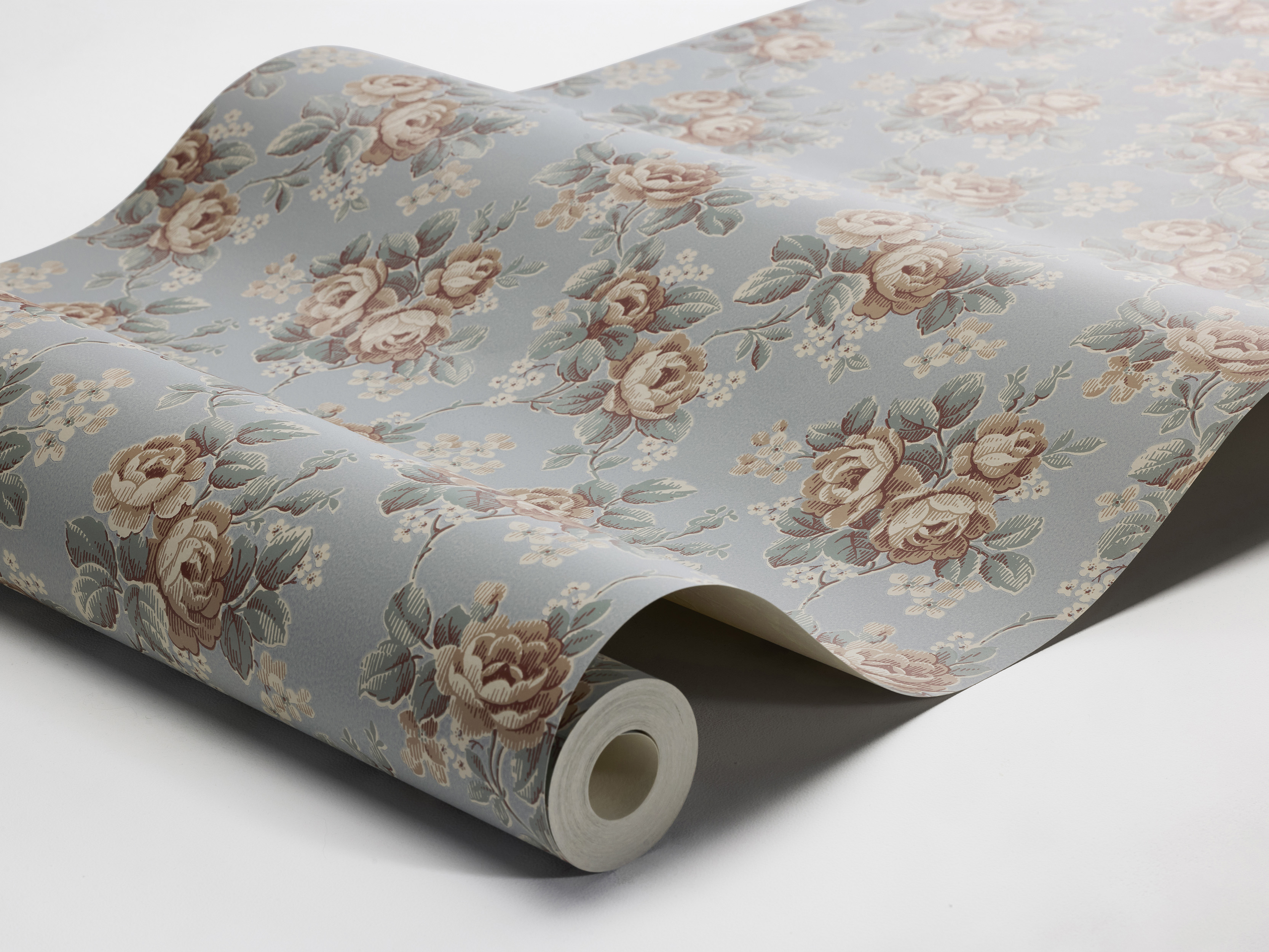 Nuspalvinti švelniu dangaus mėlynumo atspalviu, „Helena“ tapetai atkuria romantišką archyvinį rožių raštą su žiedų kekėmis, detaliai perteiktomis abrikosų, mėlynos ir kreminės baltos spalvų tonais. Paviršiaus spaudos technika suteikia raštui sodrumo ir žavingo rankų darbo charakterio, išsaugant originalią archyvinio dizaino meistrystę.