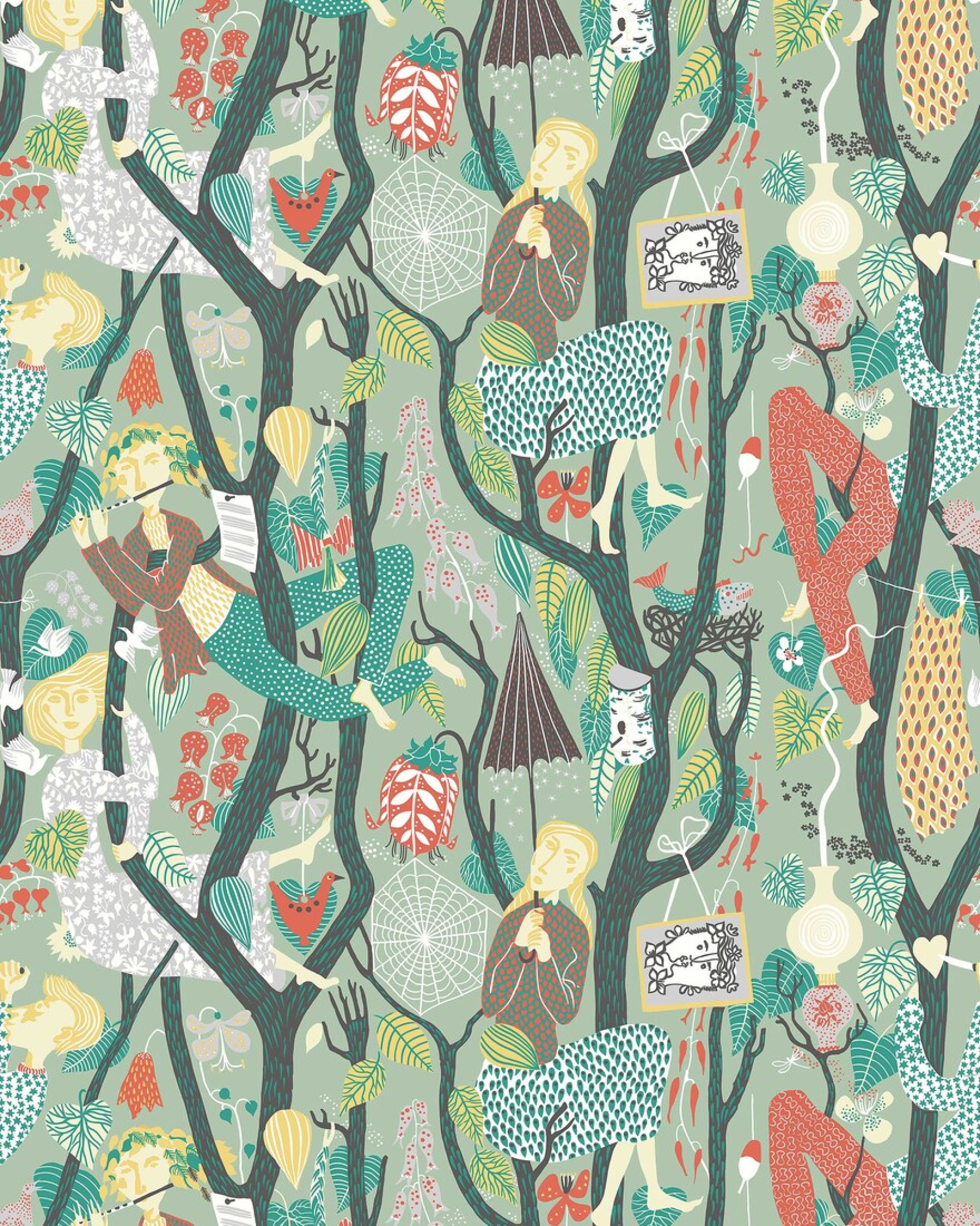 Kuo ilgiau žiūrėsite, tuo daugiau žaismingų detalių atsiskleis „Melodi“ tapetuose. Ryškiais, sodriais žalios spalvos tonais nuspalvintame rašte tarp lapų, voratinklių ir vingiuojančiomis šakomis gėlių laipioja žaismingos figūrėlės – tai vaizduotės kupinas dizainas.