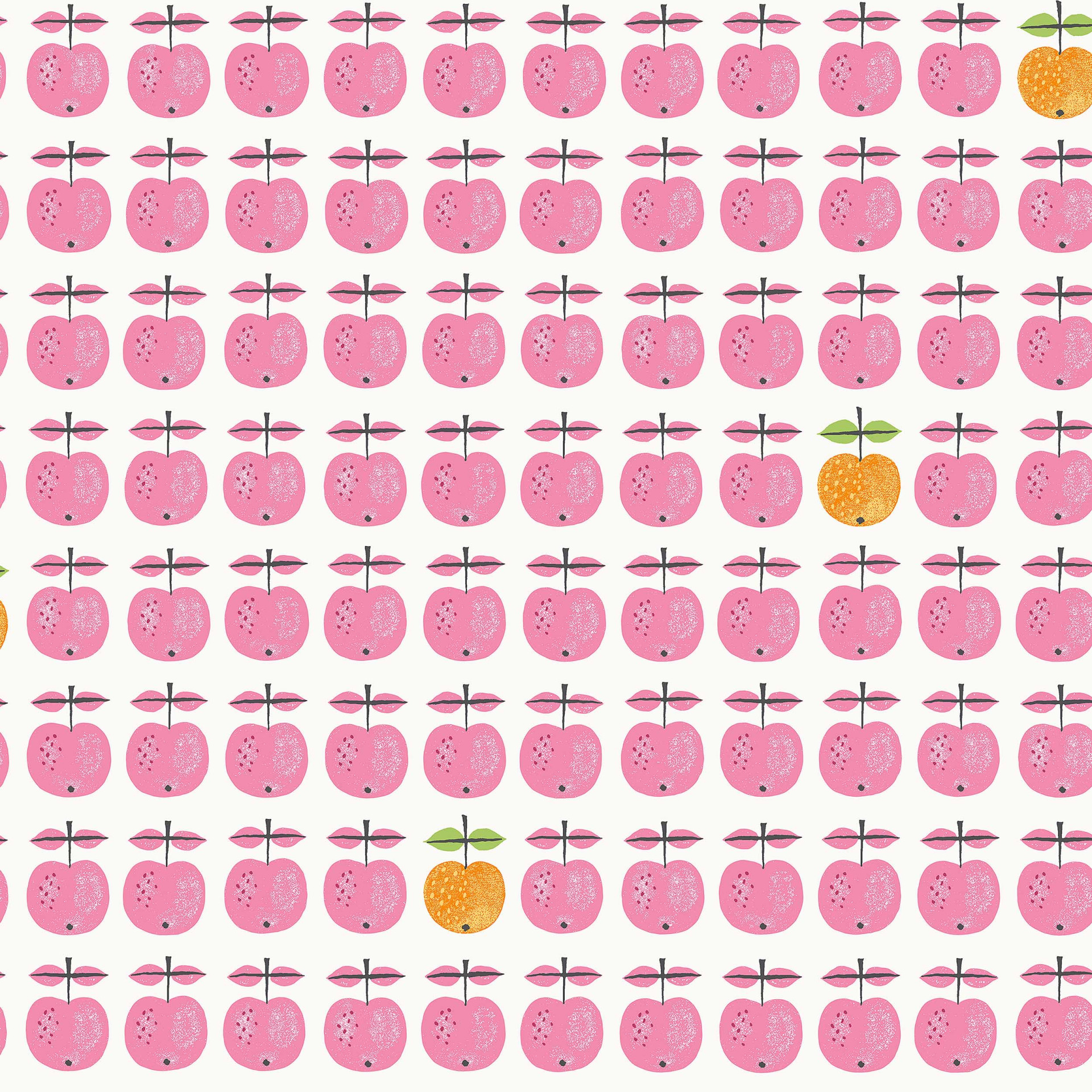 Iš Stig Lindberg itin pamėgtos XX a. 7-ojo dešimtmečio porceliano serijos kilęs dizainas dabar puošia „Pall“ tapetus. Švariame baltame fone žaismingi stilizuoti rožinės spalvos obuoliai išdėstyti tvarkingomis eilėmis, o retkarčiais pasirodantis geltonai oranžinis obuolys suteikia gyvybingo kontrasto.