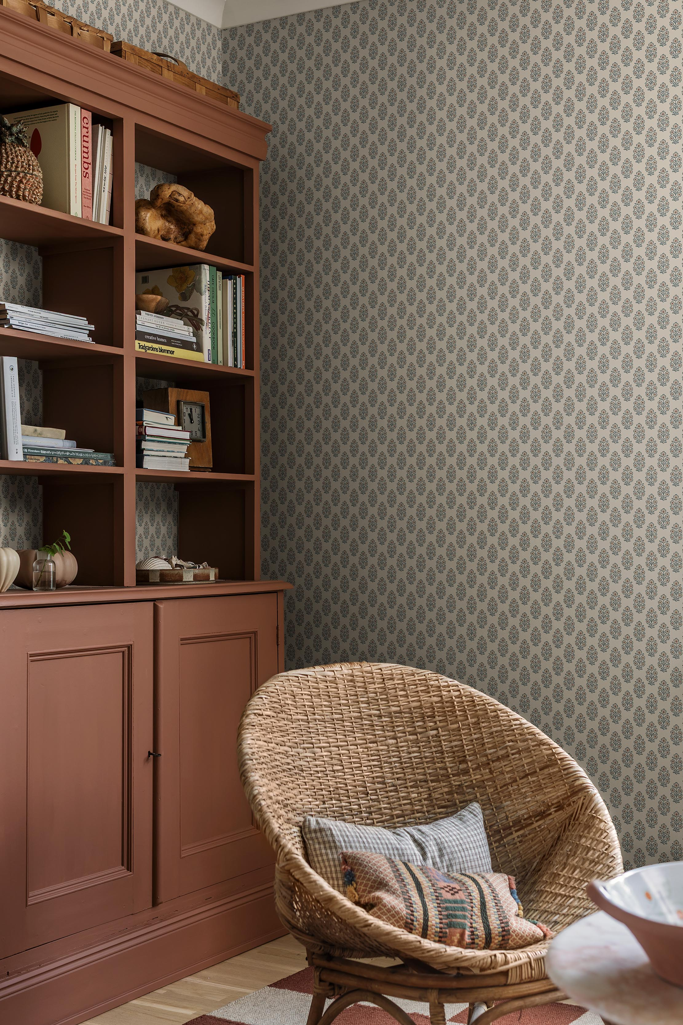 „Sibylla“ tapetai, pateikti šviesaus lino fone, vaizduoja smėlio spalvos žiedus su rūdžių rudumo vidurėliais ir melsvą lapiją. Puokščių motyvas yra naujai nupieštas, tačiau remiasi klasikinių blokinės spaudos tradicijų paveldu, sukuriant raminančią ir harmoningą rašto kartotę.